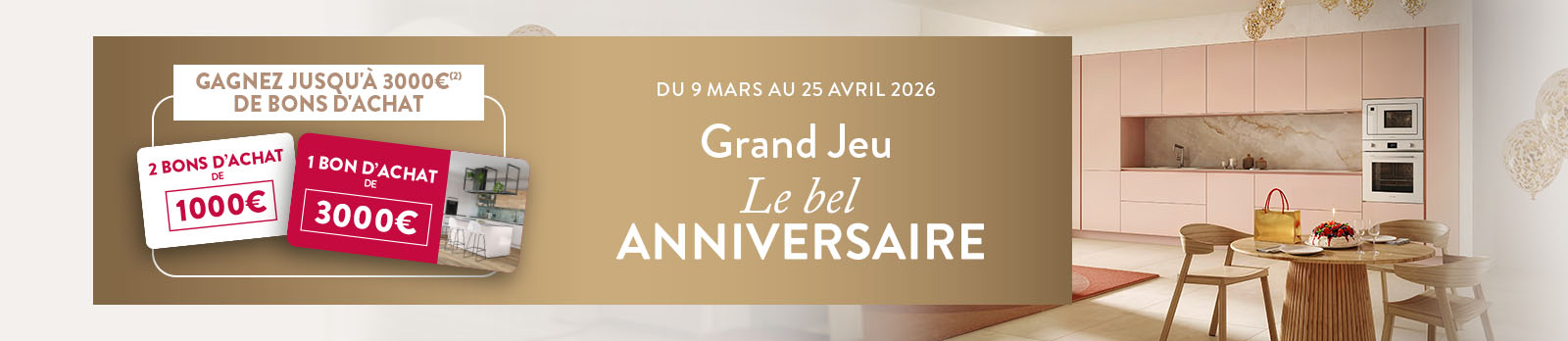 Du 9 mars au 25 avril 2026, tentez de remporter l'un des 2 bons d'achat de 1000€ ou le bon d'achat de 3000€* à l'occasion de notre Grand Jeu “Le Bel Anniversaire" !