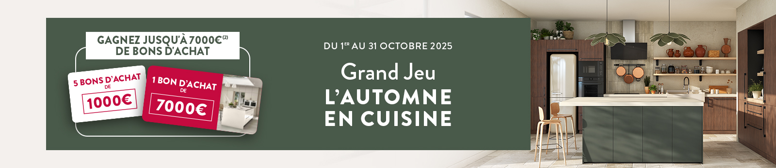 Du 1er au 31 octobre 2025, tentez de gagner l'un des 5 bons d'achat de 1000€ ou un bon d'achat exceptionnel de 7000€* à l'occasion de notre Grand Jeu “L'Automne en Cuisine" !