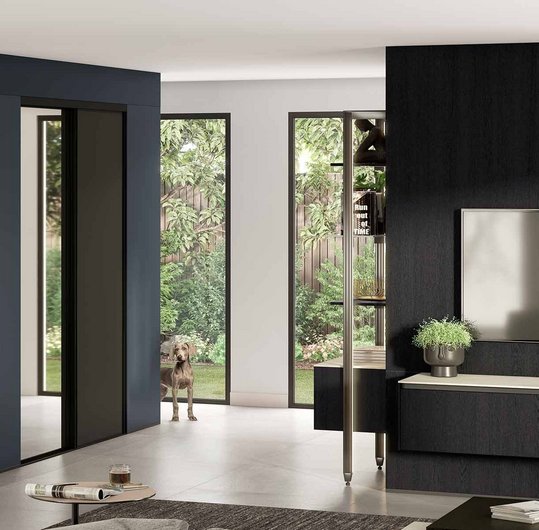 Et pour agrémenter la pièce, un living dans la continuité de la cuisine, délimité par le bloc noir, aux étagères et meubles vitrines qui l’habillent harmonieusement.