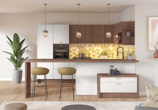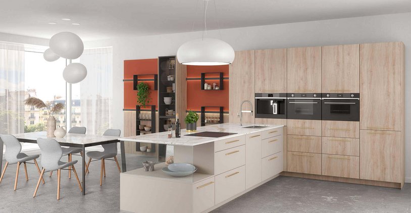 L’effet noyer warmia, riche en couleurs et nuances, donne une profondeur inégalée tandis que le hêtre et le bouleau, plus clairs, apportent une luminosité douce et subtile à votre intérieur. Chaque nuance a sa personnalité, à vous de choisir celle qui résonne le mieux avec votre style. Si vous décidez d’ouvrir votre cuisine, vous verrez aussi que la nuance de bois a son importance, puisqu’elle devra s’intégrer avec le reste de vos pièces à vivre.