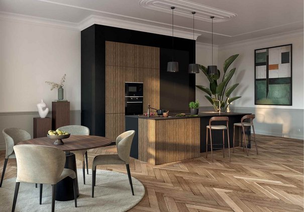 Harmonisez votre cuisine noir et bois avec la bonne teinte de mur. Conseils déco de Cuisine Plus.