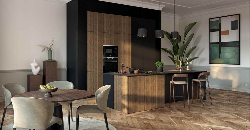 Il est essentiel pour affirmer la modernité de votre cuisine. Misez plutôt sur des meubles aux lignes épurées et aux finitions soignées, avec une préférence pour des façades sans poignée, qui ajoutent du style minimaliste à votre cuisine. Vous pouvez également jouer sur les hauteurs et les volumes pour créer une dynamique dans l'espace : alternez entre des éléments hauts et bas et intégrez un îlot si votre cuisine le permet, le must pour ajouter une touche contemporaine. L'îlot pourra alors être utilisé de différentes manières, que ce soit comme une surface de préparation et de rangement supplémentaire, ou encore de coin repas.