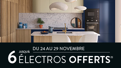 Jusqu'au 29 novembre seulement, bénéficiez jusqu'à 6 électros offerts* pour l'achat de votre cuisine sur-mesure.