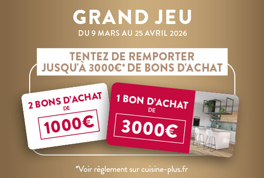 Jusqu'au 25 avril, tentez de gagner l'un des 2 bons d'achat de 1 000€ ou le bon exceptionnel de 3 000€ mis en jeu à l'occasion de notre Grand Jeu Cuisine Plus.