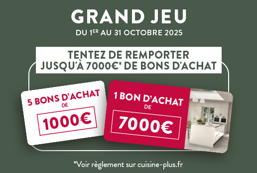 Jusqu'au 31 octobre, tentez de gagner l'un des 5 bons d'achat de 1 000€ ou le bon exceptionnel de 7 000€ mis en jeu à l'occasion de notre Grand Jeu Cuisine Plus.