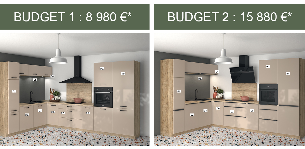 Cuisine n°2 : finitions haut de gamme, appareils premium, accessoires personnalisés, budget majoré.